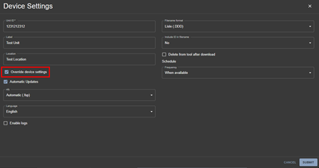 Step 6: Enter the Terminal ID (required) and a label and location (optional), ensure 'Override device settings' has been checked.