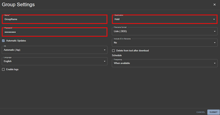 Step 4: In the company creation screen, set the Company Name and Password (used for retreiving files), and set destination to 'Hold'.
