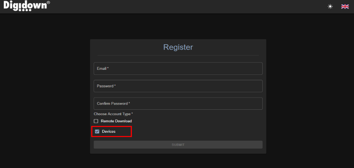 Step 2: In the register screen, enter account details to use, and ensure 'Devices' has been checked before submitting.